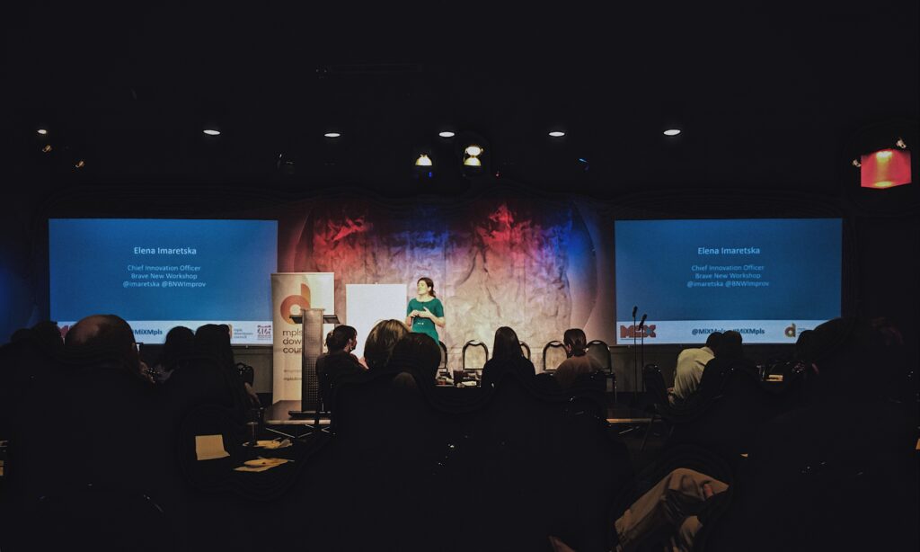 Elena Imaretska, Chief Innovation Officer for Brave New Workshop, began the evening’s program with an intro to improv. She had three assumptions for us to keep in mind during the exercise: