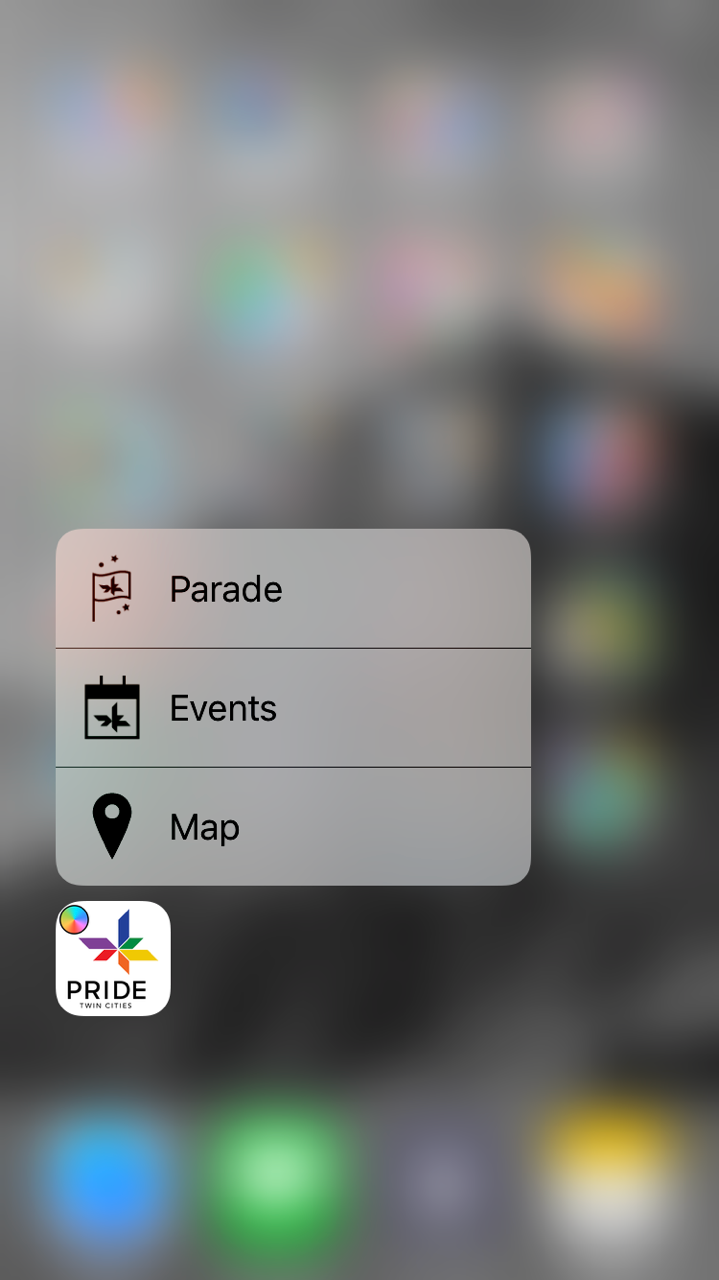 Ahead of Twin Cities Pride 2017, we decided to make some changes to our accompanying iOS app that would take advantage of new iPhone features. The Pride app serves as a guide for the festival and parade, and is written in Swift 3.0. One newly implemented feature is known as Home Screen Quick Actions. This feature gives users with an iPhone 6s or 7 the ability to “3D touch” an app icon on their home screen to use app shortcuts. We used this feature to show users shortcuts to the parade, events, and map pages of the app.