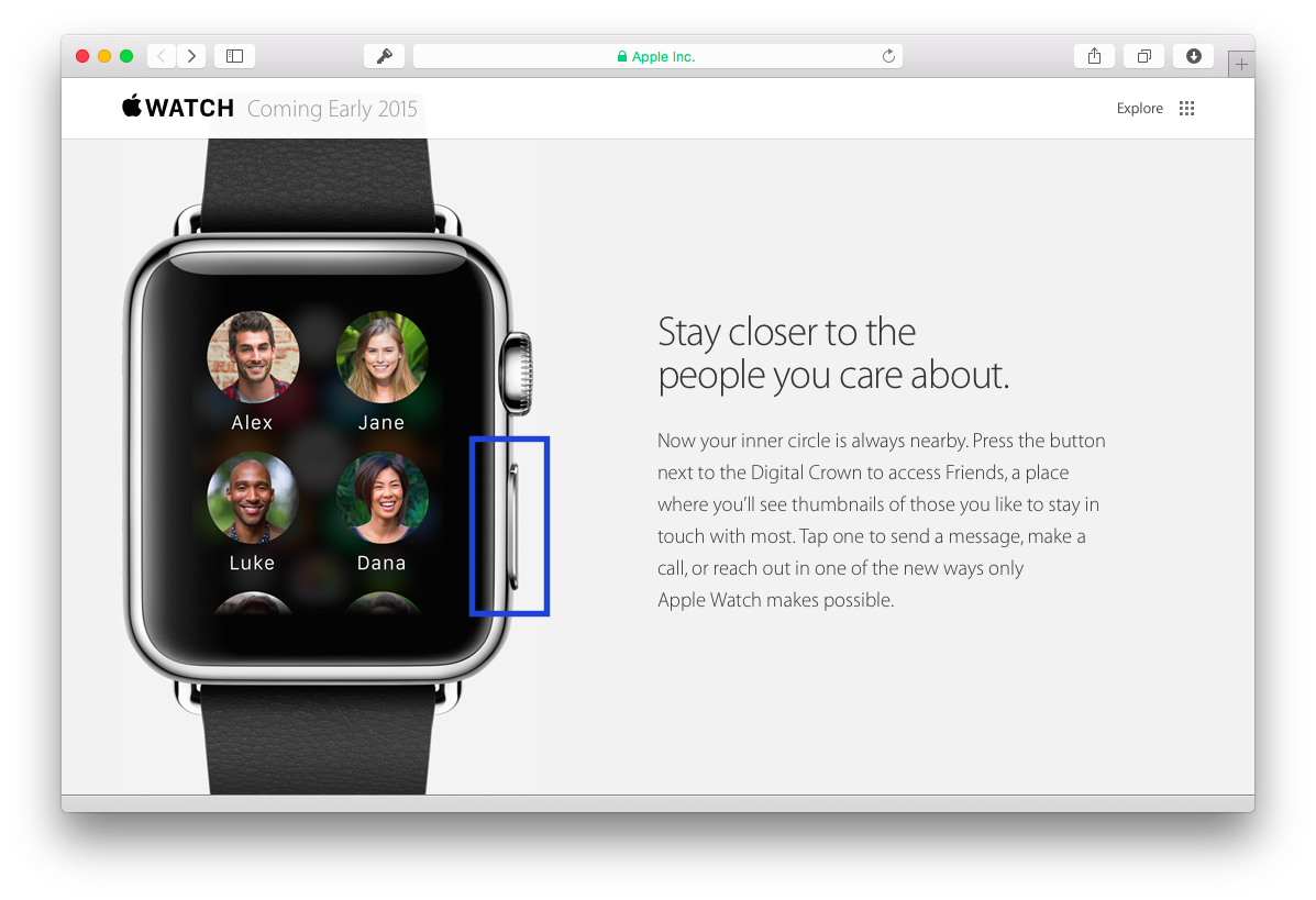 The button is for Continuity. I think the Contacts button is going to evolve into a tool for initiating a Continuity session. It’ll work something like this: Press the button on your Watch, and the dumb-screen tablet you just picked up flashes to life with the email you were writing on your laptop. Maybe there’s an authentication needed for new devices: tap the TouchID sensor on your watch and you’re instantly logged in. If you have multiple dumb screens within reach, say a tablet and a laptop, just use the Digital Crown to select the one you want to use. Or maybe cute icons of your iPad, MacBook Air, and various Apple TVs will pop up.