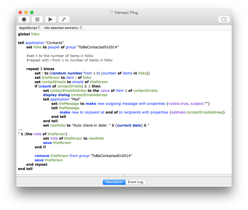 Scratching my own itch, I’d like to tell you a bit about an AppleScript tool I made to help me keep in contact with all of the good folks I’ve met over the years. The concept is simple: Remind me to reach out and connect with 2 or 3 people each day that I haven’t talked to in a while.